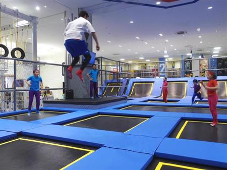 フードコートから見える底上げされた空間で子供たちがはねている。ブロック状に仕切られる形で何枚ものトランポリンが敷かれていて、その上を前後左右に行き来して楽しんでいる。横に目を向けると、長方形のフィールドがトランポリンで仕切られたスペースがあって、インストラクターがジャンプしながら手にしたボールをぶつけ合っている。トランポリン上でプレーするドッジボールといったところだ。