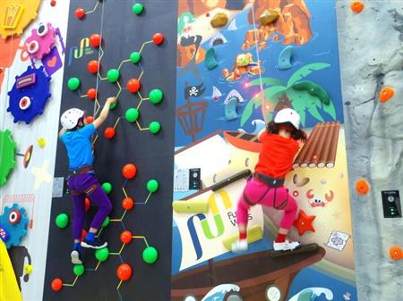 トランポリンだけではない。「TONDEMI」には壁に突き出た突起に指やつま先をかけて上っていくウォールクライミングのコーナーも設置。世界的に知られたブルガリアのウォールトピア社が開発した「FUNWALLS」が多数並んでおり、難易度や好みに合わせてクライミングを楽しめる。ロープウォークエリアもあって、こちらもウォールトピア社製の「ROPETOPIA」を屋内の施設としては日本で初導入。3メートルの高さに張り巡らされた橋や網、タイヤなどを渡ってスリルを味わい、体力やバランス感覚を養う。
