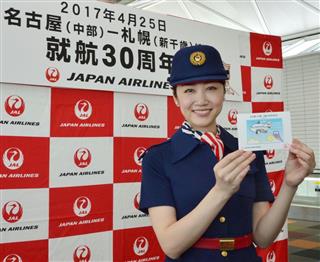 日本航空は25日、名古屋と札幌を結ぶ路線が就航30周年を迎えたことを受け、記念式典を中部空港(愛知県常滑市)で開いた。式典では、デザイナーの森英恵さんが手掛けた1987年当時の制服を客室乗務員が着用し、乗客らの撮影に応じた。