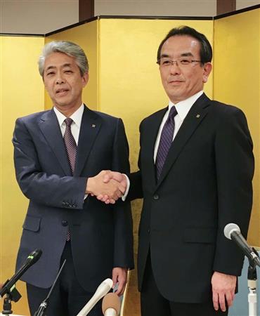 • 京セラの山口悟郎会長(左)と握手する谷本秀夫社長=2月20日、京都市