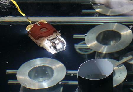 東京電力福島第1原発3号機の原子炉格納容器を模したプールの中を移動するロボット=15日午後、神奈川県横須賀市【拡大】