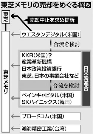 東芝メモリの売却先候補をめぐり、官民ファンドの産業革新機構などに、米ファンドのベインキャピタルと韓国半導体大手SKハイニックスの「米韓連合」が加わる「日米韓連合」が浮上した。ただ、革新機構などと米ウエスタンデジタル(WD)が合流する選択肢も残る。米半導体大手ブロードコムも好条件を示しており、売却先選定は予断を許さない状況が続く。(万福博之)