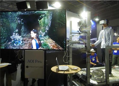洞窟の中に入ると、奥の方から風が吹いてくる。前を行く女性からは、ほのかな香りが漂ってくる。風は、前方に取り付けられた送風機が映像に連動して動作する。香りは、VRヘッドマウントディスプレーに取り付けられた、香りを発生させるデバイス「VAQSO VR」から出ている。洞窟を抜けて海岸に出た時に、手を引いていた女性が自分の横に位置を移す場面では、握っていたロボットアームが横にスライドして女性の動きを再現する。