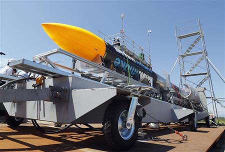 「インターステラテクノロジズ」の観測ロケット「MOMO」=26日、北海道大樹町【拡大】