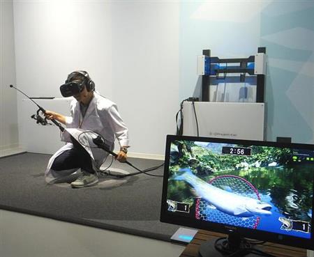 VRヘッドマウントディスプレーを装着し、右手に釣り竿のようなコントローラーを持って立つと、目の前には緑に囲まれた池が見える。釣り竿を振ると、視界の中ではルアーが飛んでいって池に落ちる。魚が食いつくと釣り竿が引かれる感じになるため、リールを巻いてルアーをたぐり寄せ、近づいてきた魚を左手に持った網ですくい上げる。