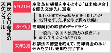 東芝が日米韓連合を優先交渉先に選んだのは6月21日。当初はその1週間後の同28日までに契約したいとしていた。既に予定を約1カ月半も過ぎており、暗礁に乗り上げているようにさえみえる。