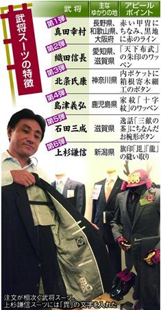 戦国武将をモチーフにした男性用オーダースーツを、大阪市の紳士服メーカーが次々に商品化している。平成26年に第1弾となる「真田幸村スーツ」を発売して以降、全国の歴史ファンから注文が舞い込み、今では武将スーツを年2本のペースで展開。今月1日には第6弾の「上杉謙信スーツ」も登場し、進出地は全国に広がってきた。