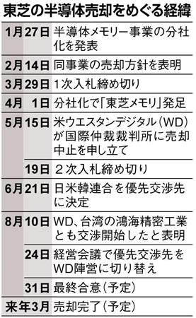 買収は日本勢が過半を出資して経営権を握る。WDは議決権のない社債などの形で数千億円拠出し、独占禁止法の審査を終えた後に2割未満の議決権を取得する方向だ。WDと東芝メモリは同業で、当初から議決権を得れば独禁法審査が長引く可能性があるためだ。ただ、東芝関係者は「WDの言い分と契約書の案に乖離(かいり)がある」と不安を口にする。