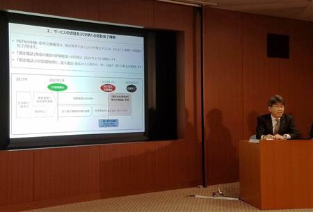 固定電話のIP電話化の時期を発表するNTT東日本の高美浩一取締役=17日、東京都千代田区【拡大】