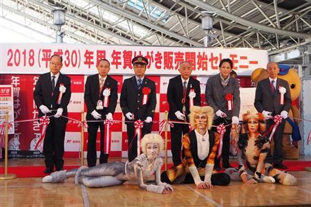 劇団四季のミュージカル「キャッツ」大阪公演の出演者たちが1日、大阪市北区の大阪ステーションシティ・時空(とき)の広場で行われた、大阪北郵便局主催「平成30年用年賀はがき販売開始セレモニー」に出席した。