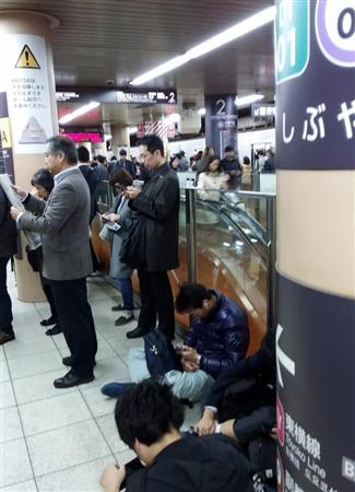 • 東急田園都市線渋谷駅ホームで、運転再開を待つ通勤・通学客ら=15日午前9時50分、東京都渋谷区(高橋裕子撮影)