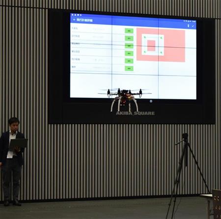 7日に東京都内で行われた試験飛行ではドローンが「蛍の光」を流しながら設定ルートを飛行した。ドローンに搭載した受信機とフロアに設置した発信機を使って、ドローン自身が位置情報を特定する。