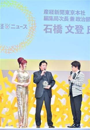受賞トロフィーを受けとった産経新聞東京本社の石橋文登政治部長。左は司会の叶美香さん=23日午後、東京都港区(宮崎瑞穂撮影)【拡大】
