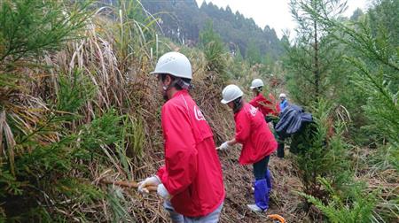 社員らが参加して行われた下草刈りの様子=11月29日、宮崎県えびの市【拡大】