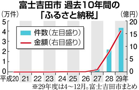 山梨県富士吉田市の堀内茂市長は10日の記者会見で、今年度の「ふるさと納税」による寄付金額が、昨年12月末に16億円を超えたと発表した。早くも過去最高の平成28年度(通年で約7億6643万円)を更新し、2倍強の水準に達した。返礼品目を増やし、全国の自治体の返礼品を紹介するポータルサイトへの参加を増強した。堀内市長は「リピーターが多い。職員の素早く、ていねいな対応が効果を上げている」と取り組みに自信を示した。
