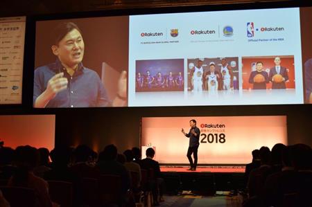 「楽天市場」の出店者らに対して講演する楽天の三木谷浩史会長兼社長=30日、東京都港区【拡大】