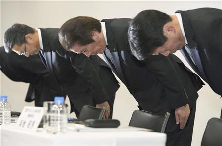 記者会見の冒頭、謝罪する三菱マテリアルの竹内章社長(中央)と小野直樹副社長(左)ら=8日午後、東京都文京区【拡大】