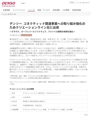自動車部品大手デンソーは14日、ソフトウエア開発のベンチャー企業クリエーションライン(東京)に出資したと発表した。通信機能を持ち幅広いサービスを提供する車「コネクテッドカー(つながる車)」の情報処理システムを共同開発する。出資比率と金額は非公表。