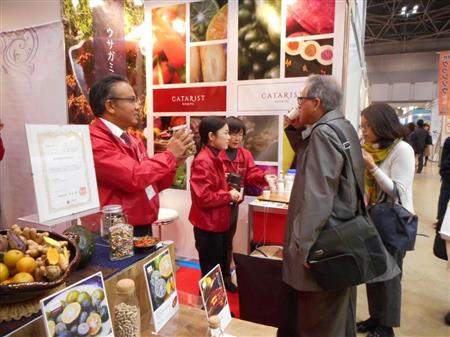 3月発売予定の「シンジムンの力」シリーズを展示したカタリスト琉球(沖縄県うるま市)の稲福直専務は来場者に試飲を勧めながら、ヘスペリジンによる血流冷え性改善効果をアピール。その場で「ポカポカしてきた」と効果を実感する人もいた。