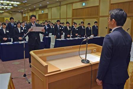 入社式で決意表明するホテルニューアワジグループの新入社員【拡大】