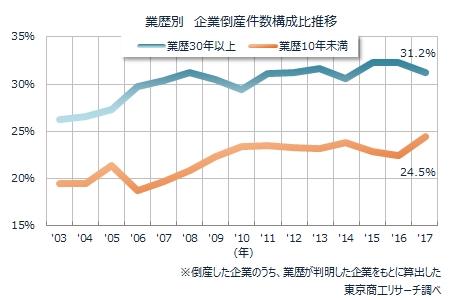 2017年に倒産した企業で、老舗企業の構成比を産業別にみると、最高は製造業の52.9%(前年51.6%)で半数を占めた。以下、運輸業40.9%(同32.3%)、不動産業36.9%(同31.0%)と続き、10産業のうち、6産業が前年を上回った。