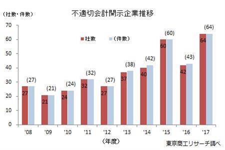 2017年度に不適切会計を開示した上場企業は64社で、前年度の42社から22社と前年度比で5割超も増加した。