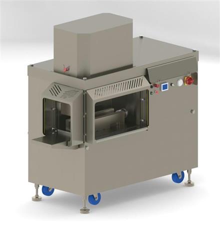 視線の先にあるのが、水道水で動く水圧技術「ADS(アクアドライブシステム)」を採用した「ADSオートプレス機」。水圧による強力なプレスで冷凍肉の厚みを整え、次工程のスライサーが同一形状・重量にカットしやすくする。展示機によるデモンストレーションには多くの入場者が足を止めて見入っていた。