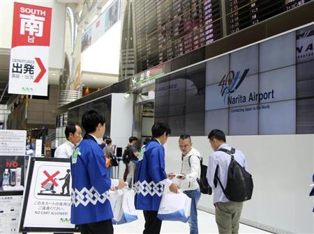成田空港が20日、1978年の開港から40年を迎え、成田国際空港会社(NAA)の新入社員らが、3つあるターミナルの各出発ロビーで、利用客に記念品のハンカチを配った。