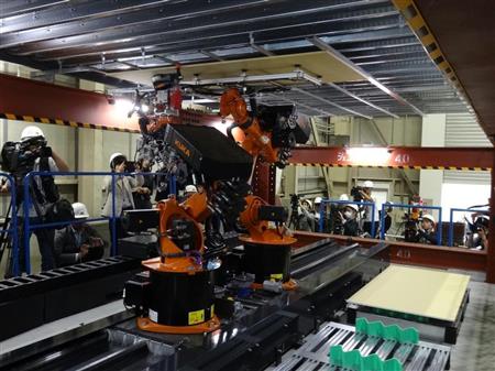鉄骨造の建物内部を模した区画に設置されたロボットは、仕事開始の指令を出すと、アームの1本が脇に置かれたパネルを天井へと水平に持ち上げ、もう1本のアームが天井部分の金属の骨組みを狙ってビスを打ち込む。「従来は職人1人が頭でボードを支えながらビスを打つ。何枚もやると首が痛くなる作業だ」と生産技術本部長の印藤正裕氏は指摘する。