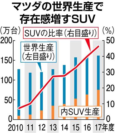 SUVの生産車種は、16年度に高効率エンジンを核とする環境技術群「スカイアクティブ」を全面採用した主力SUV「CX-5」はじめ5車種に拡大。各市場で販売するSUVの品ぞろえも拡充する方針で、今年後半に中国、オーストラリア、ニュージーランドに3列シートの新型「CX-8」を投入。21年には米アラバマ州で稼働を始めるトヨタ自動車との合弁工場で新型SUVを生産する計画だ。