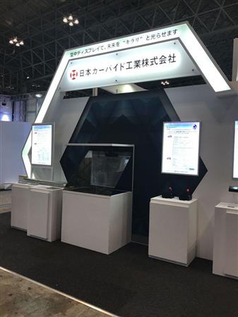 日本カーバイド工業(東京)は、特殊な樹脂で高い反射性を備えた「再帰反射」シートによる空中ディスプレーを体感できるデモ機を展示している。