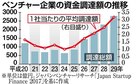 ジャパンベンチャーリサーチによると、600億~800億円台で推移していたベンチャー企業の資金調達額は2014年に1444億円に跳ね上がり、昨年は2791億円に達した。1社当たり平均調達額も約3倍の3億1640万円。日銀の金融緩和政策や企業のイノベーション志向がベンチャーキャピタル増加など、成長に不可欠なリスクマネー供給を促している。