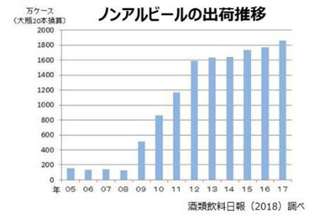 2017年のノンアルビールの販売数量は、「酒類飲料日報」推計で前年比5.3%増の1862万ケース(大瓶20本換算)となり、過去最高を記録。各社が本格展開を始める直前の2008年と比べると、約15倍に当たる数量となっています。
