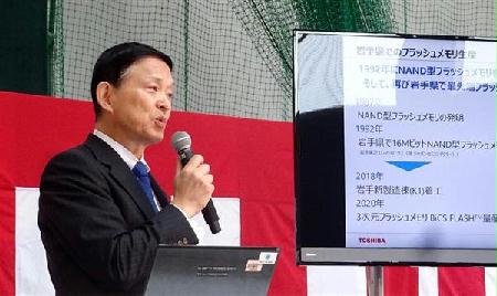 起工式後の記者会見で、成毛康雄社長は晴れやかな表情を見せた。北上工場は建屋面積4万平方メートル、5階建て。人工知能(AI)を活用した生産システムも導入し、2年後の量産開始後は1千人余りが働く。