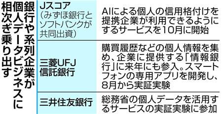 銀行やその系列企業が個人データを本人の同意を得た上で企業に提供するビジネスに乗り出す。みずほ銀行とソフトバンクが共同出資するJスコアは人工知能(AI)が判別した個人の信用格付けを10月から企業が利用できるようにするほか、三菱UFJ信託銀行は購買履歴などを企業に提供する「情報銀行」を来年にも事業化する。金融資産の管理ノウハウを生かし、新たな収益源の創出を狙う。