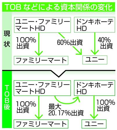 ユニー・ファミリーマートホールディングス(HD)は11日、株式公開買い付け(TOB)を実施して提携先のディスカウント大手ドンキホーテHDの株式を最大20.17%取得し、グループ会社化すると発表した。