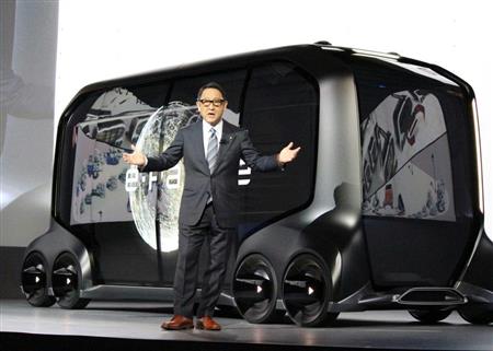 トヨタ自動車の豊田章男社長は米ラスベガスで開かれた家電見本市「CES」で「e-Palette(イーパレット)」を披露した=1月8日(共同)