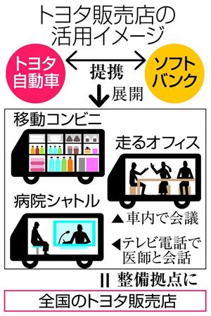 トヨタ自動車が、携帯電話大手ソフトバンクと2023年以降に始める次世代の自動運転車を使った移動サービスで、トヨタの販売店を車両の整備拠点として活用することが26日、分かった。約5000ある店舗網を生かし、過疎地での乗り合いバスなど地域活性化につながる事業を全国に展開する方針だ。