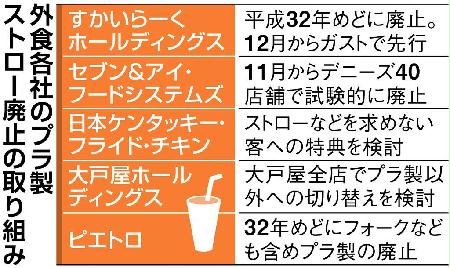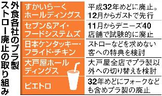 平成32年をめどにプラ製ストローの廃止を目指すファミリーレストラン大手のすかいらーくホールディングス(HD)は、12月に傘下の「ガスト」でドリンクバーのストローを廃止するなど先行する。