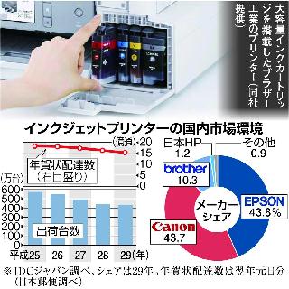 秋が深まる中、今年も年賀状印刷に便利なインクジェットプリンターの新製品が出そろった。もっとも、新年のあいさつをメールやSNS(交流サイト)で済ませる人が多くなり、市場規模は縮小が続く。各メーカーは、1枚当たりの印刷コストを節約できる「大容量インク」の機種を増やすなどし、年末以外の“日常使い”を広げたい考えだ。