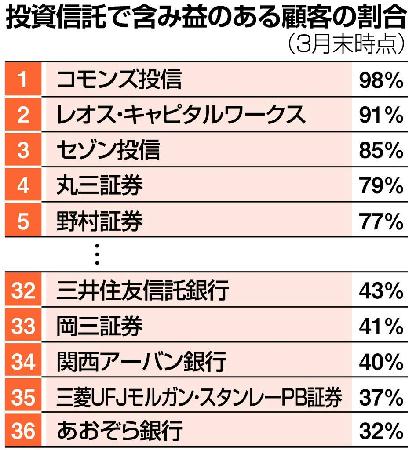 含み益のある顧客の割合はトップのコモンズ投信が98%で、ひふみ投信などを運用するレオス・キャピタルワークスが91%、セゾン投信が85%と続いた。上位3社は大手金融機関系列に属さない独立系で、毎月決まった額の投信を買ってもらう積み立て投資に注力する共通点がある。一方、あおぞら銀行や三菱UFJモルガン・スタンレーPB証券は含み益のある顧客の割合が4割を割り込んだ。