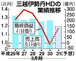 三越伊勢丹HDは30年3月期連結決算で構造改革に伴う特別損失261億円を計上したことなどから9億円の最終赤字に陥った。だが、杉江俊彦社長の「構造改革でうみを出し切った」との言葉通り、30年9月中間決算は本業のもうけを示す営業利益が前年同期比41.5%増の108億円に改善。31年3月期も最終損益を130億円の黒字とする予想を据え置き、V字回復へ道筋を付けた形となった。
