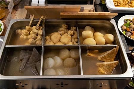 アニメ第2話で登場した「若鶏のから揚げ」は大豆ミートを使いジューシーさと揚げたて食感が再現されている。また、「おでん」には、通常よく使われるカツオだしではなくコンブだしを使用し、ダイコンやコンニャクといった野菜中心の具材を取りそろえた。日本食の作法にとらわれず楽しんでもらおうと、ビュッフェ形式で提供されている。