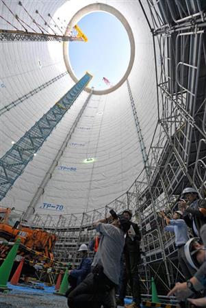 JR東海は28日、東京都品川区に建設中のリニア中央新幹線「北品川非常口」の内部を報道関係者に公開した。リニアは2027年に品川-名古屋間の約286キロが開業予定。直径約36メートル、深さ約90メートルの「立て坑」で地上とつながる非常口はリニア車両が走るトンネルの掘削工事の拠点で、営業運転開始後はトンネル内の換気や地上への避難通路の役割を担う。