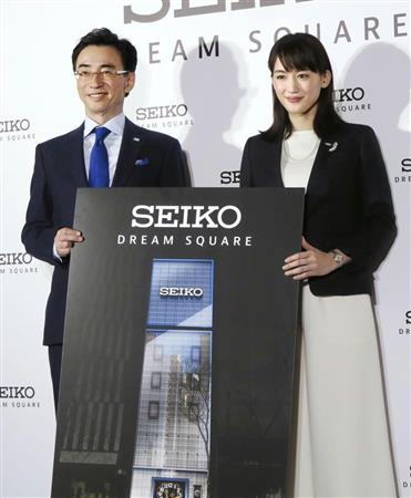 記者会見した女優の綾瀬はるかさん(右)とセイコーウオッチの服部真二会長=19日、東京都中央区【拡大】