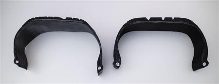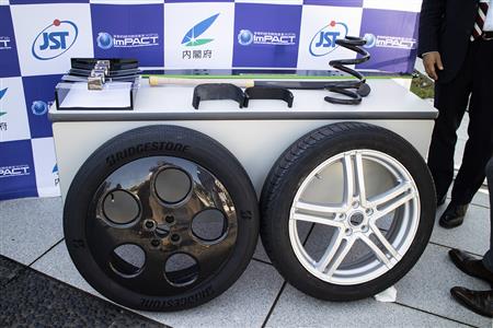 そしてタイヤ。ここにも「しなやかタフポリマー」の応用が進められている。タイヤの骨格であるカーカスは合成繊維の糸(コード)を密な簾(すだれ)状に引き揃え、合成ゴム(これもポリマー)で貼り合わせたもの。この骨格材を構成するポリマーの靱性と疲労強度を飛躍的に高めれば、骨格を薄くできる。つまり軽くてしなやかなタイヤになるわけだ。このポリマーの開発には九州大学、京都工芸繊維大学などが参画、タイヤにまとめあげるのはブリヂストンが担当している。このタイヤを組み合わせるホイールもCFRP成形品であり、もちろんTCMが設計、製造したもの。