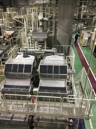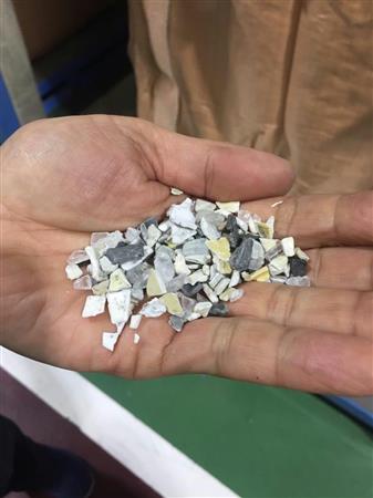 その後、水より重いABS、PS、さらに重い廃プラスチックを分別して取り出すため、「ジグ選別機」という独自開発した装置を用いて、水中でそれらを上下に振動させ、比重差で階層ができる特性を利用し、ABSとPS、そのほかの重比重プラスチックに選別する。これら工程で使われる水は、全て循環利用されており、「下水、河川などへの排水は一切ない」(坪井社長)と胸を張る。