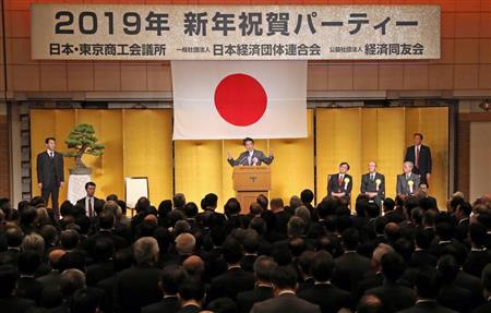 経団連などの経済3団体や業界団体が開いた新年祝賀会。経営トップからは企業業績の堅調さを強調する意見の一方、米中貿易摩擦などの地政学的リスクについて懸念の声が相次いだ。安倍晋三首相が求めた賃上げで、ベースアップ(ベア)への明言がほとんど見られないなど、先行きの不透明感が経済界全体を覆っている。