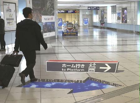 京浜急行電鉄は28日、目の錯覚を活用した案内手法「錯視サイン」を鉄道事業者として初めて導入した。羽田空港国際線ターミナル駅の床に貼り付けた絵が立体的に浮かび上がって見え、京急線ホーム行きのエレベーターの方向を示す。