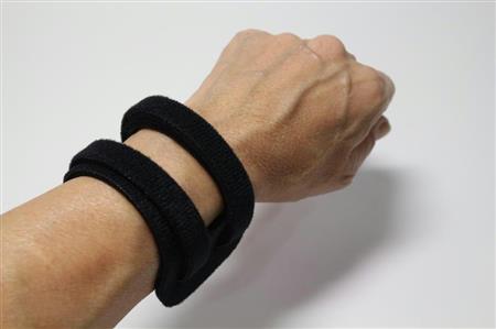 日常の動作に支障なく使える手首サポーター。黒い2本のストラップが手首をしっかり固定。装着面積が少ないため手首の可動域が広くスムーズに動かせる。3980円。販売中。